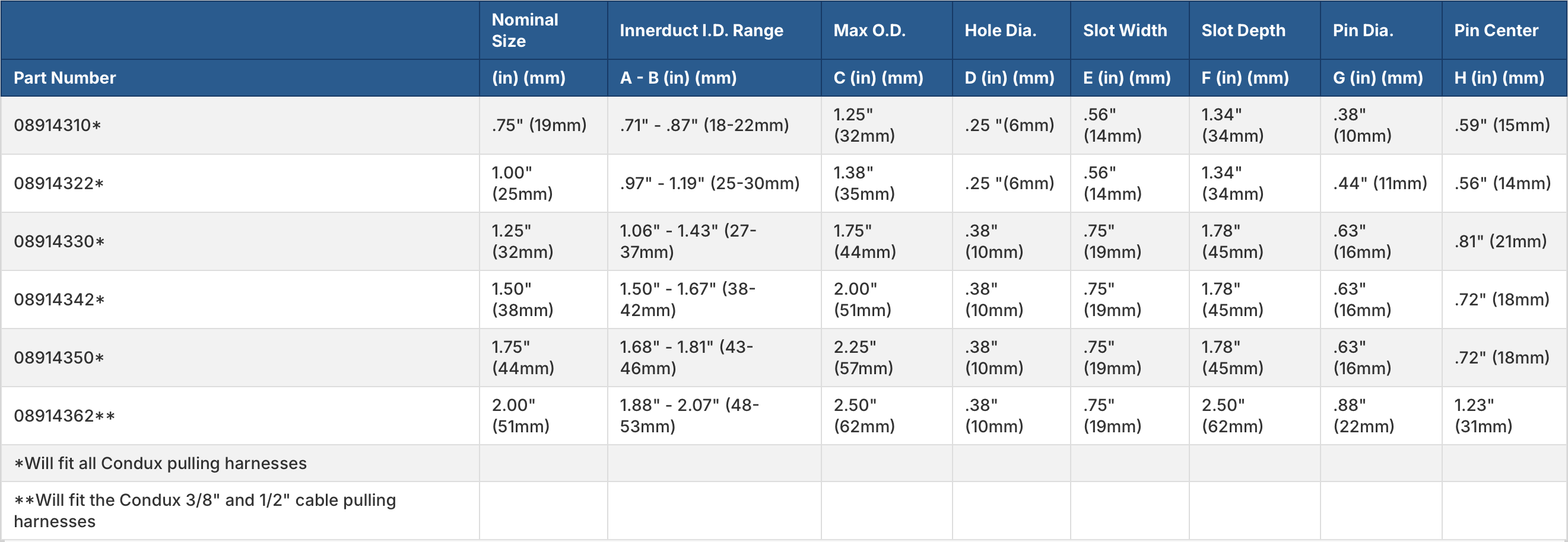 Same tapered threads as the standard innerduct pulling eye, these pulling eyes feature a slotted head with clevis pin to permit direct attachment to any Condux multiple pulling harness leg ends. When properly sized and installed, these eyes will not pull out of the innerduct until the pulling tensions have greatly exceeded the maximum pulling tensions recommended by the innerduct manufacturers.