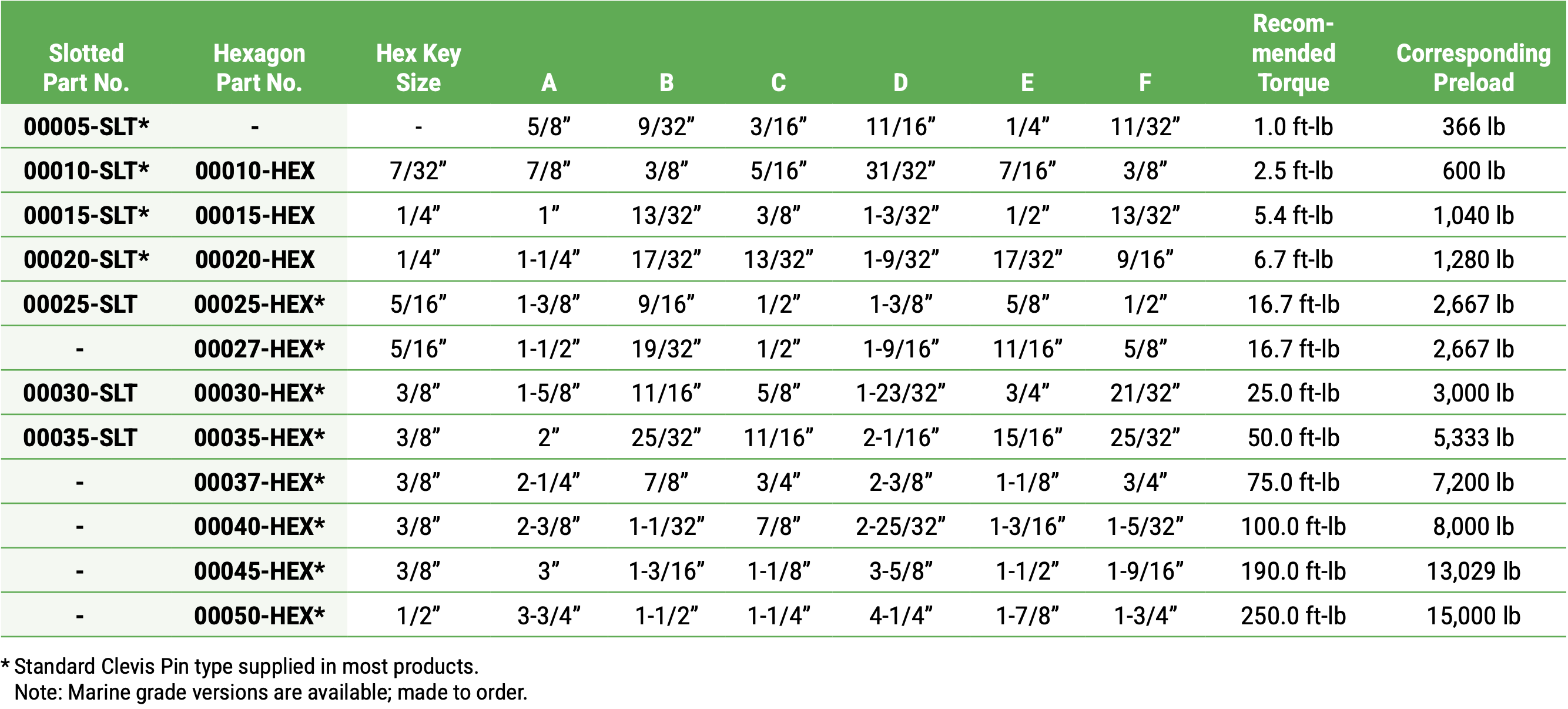 Products 1-1/4” dia. and less are supplied with slotted clevis pins; those greater than 1-1/4” are supplied with hexagon socket clevis pins. This is based on consumer preference. Either slotted or hexagon pins are available for most sizes, but must be requested at time of ordering if not standard.